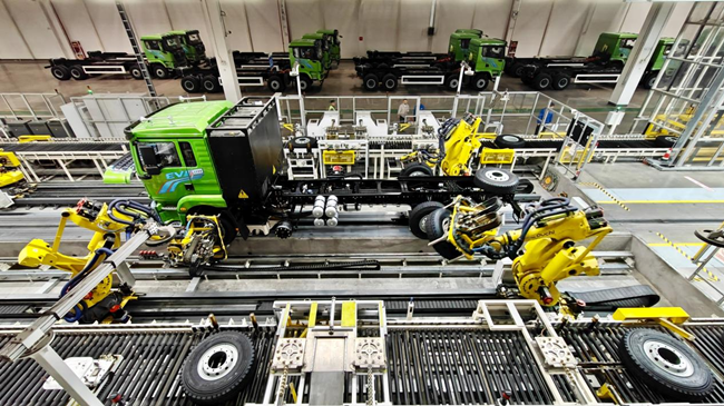 在陜汽新能源重卡生產(chǎn)基地汽車(chē)總裝配線上,一輛輛重卡從生產(chǎn)線開(kāi)出。